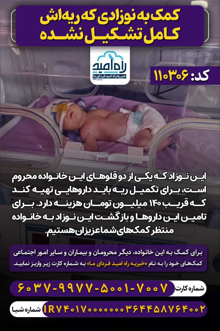 این نوزاد که یکی از دو قلوهای این خانواده محروم است، برای تکمیل ریه باید داروهایی تهیه کند که قریب ۱۴۰ میلیون تومان هزینه دارد. برای تامین این داروها و بازگشت این نوزاد به خانواده منتظر کمکهای شما عزیزان هستیم.