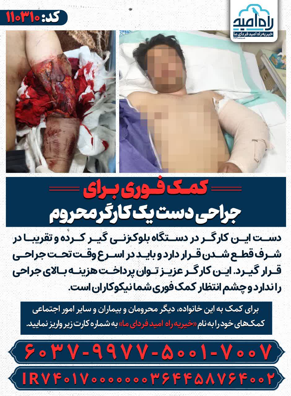 - دست این کارگر در دستگاه بلوکزنی گیر کرده و تقریبا در شرف قطع شدن قرار دارد و باید در اسرع وقت تحت جراحی قرار گیرد. این کارگر عزیز توان پرداخت هزینه بالای جراحی را ندارد و چشم انتظار کمک فوری شما نیکوکاران است.