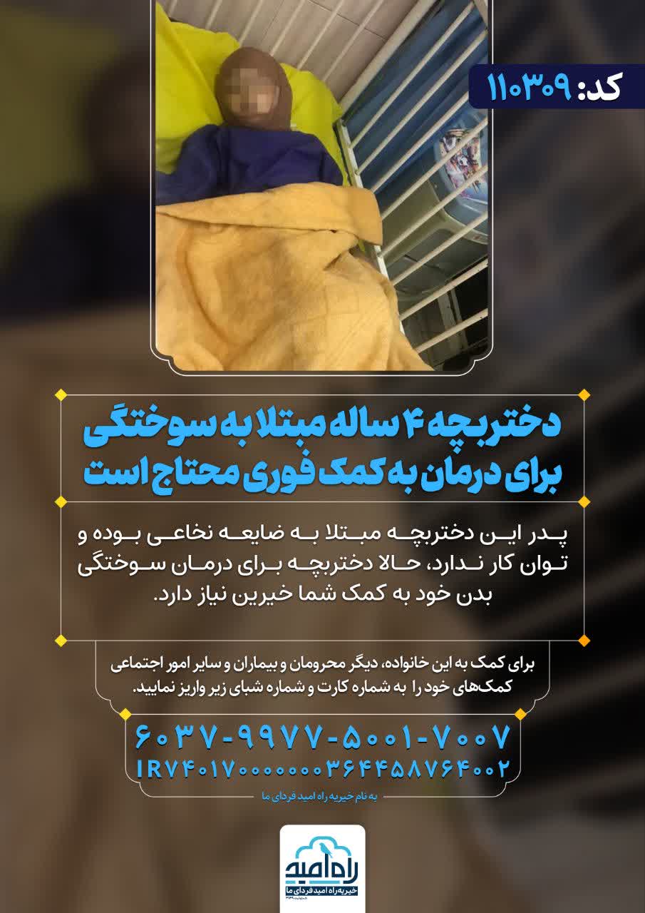 پدر این دختربچه مبتلا به ضایعه نخاعی بوده و توان کار ندارد، حالا دختربچه برای درمان سوختگی بدن خود به کمک شما خیرین نیاز دارد.