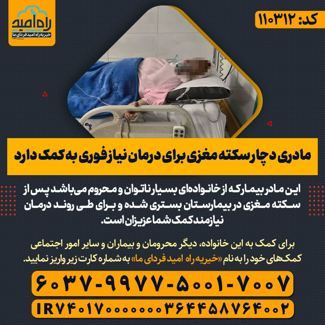 این مادر بیمار که از خانوادهای بسیار ناتوان و محروم میباشد پس از سکته مغزی در بیمارستان بستری شده و برای طی روند درمان نیازمند کمک شما عزیزان است.