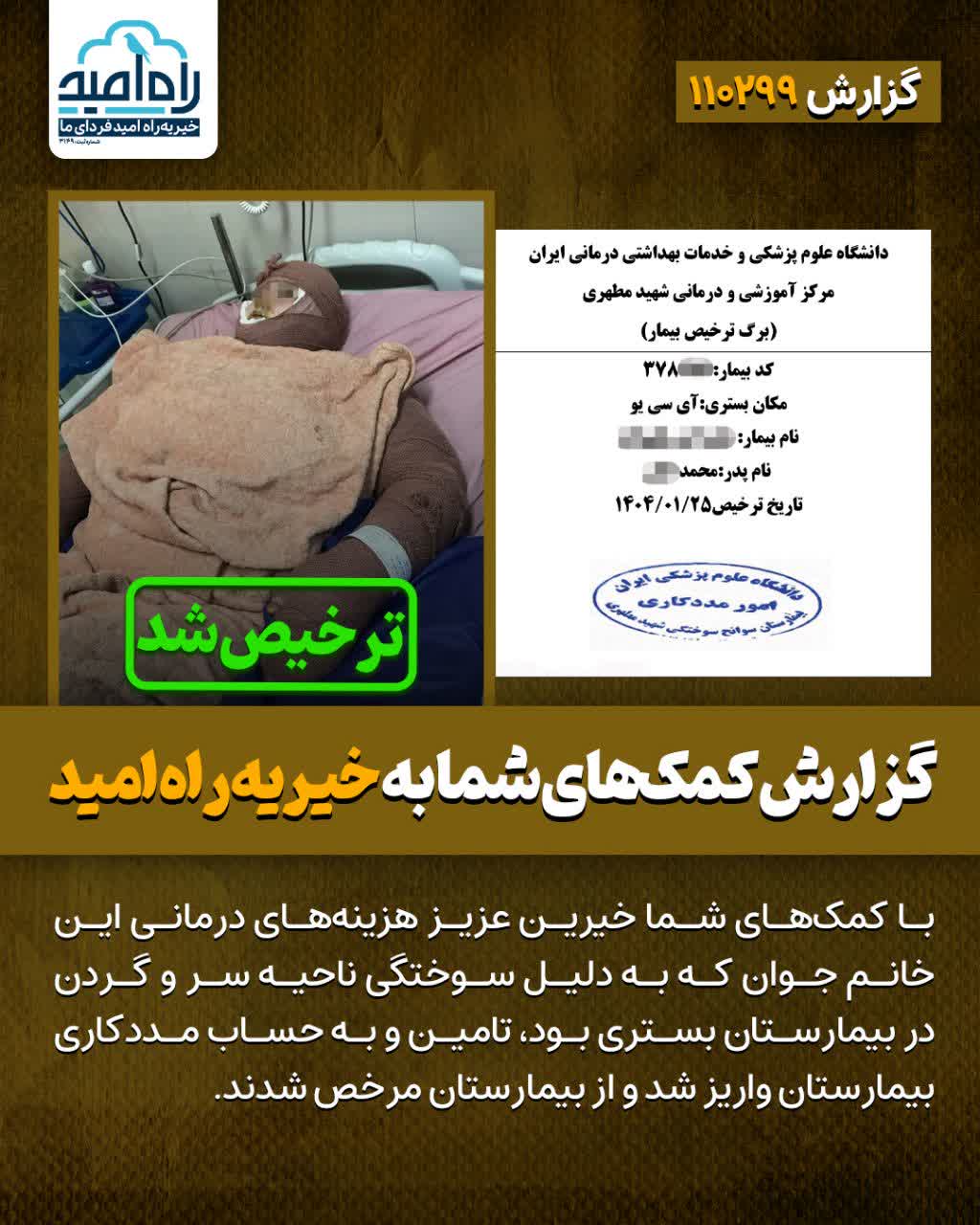 با کمکهای شما خیرین عزیز هزینههای درمانی این خانم جوان که به دلیل سوختگی ناحیه سر و گردن در بیمارستان بستری بود، تامین و به حساب مددکاری بیمارستان واریز شد و از بیمارستان مرخص شدند.