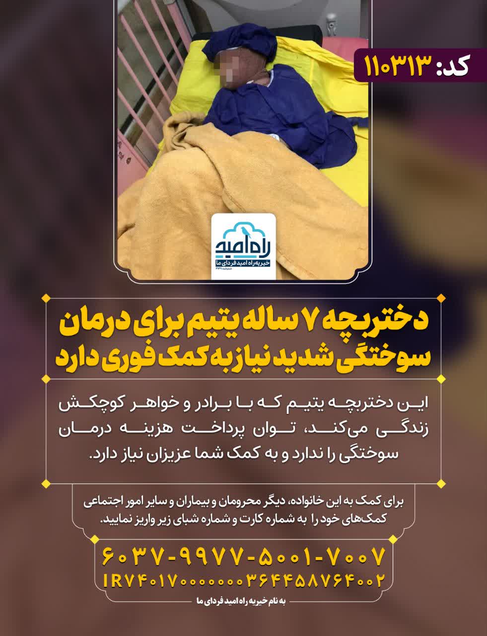 این دختربچه یتیم که با برادر و خواهر کوچکش زندگی میکند، توان پرداخت هزینه درمان سوختگی را ندارد و به کمک شما عزیزان نیاز دارد.
