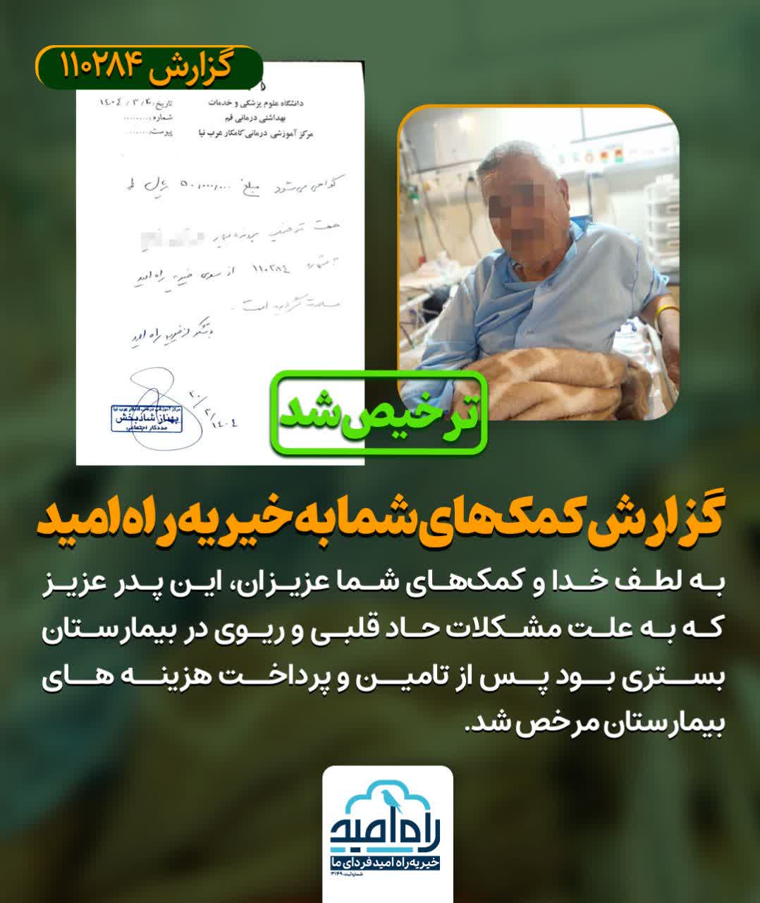 به لطف خدا و کمکهای شما عزیزان، این پدر عزیز که به علت مشکلات حاد قلبی و ریوی در بیمارستان بستری بود پس از تامین و پرداخت هزینه های بیمارستان مرخص شد.