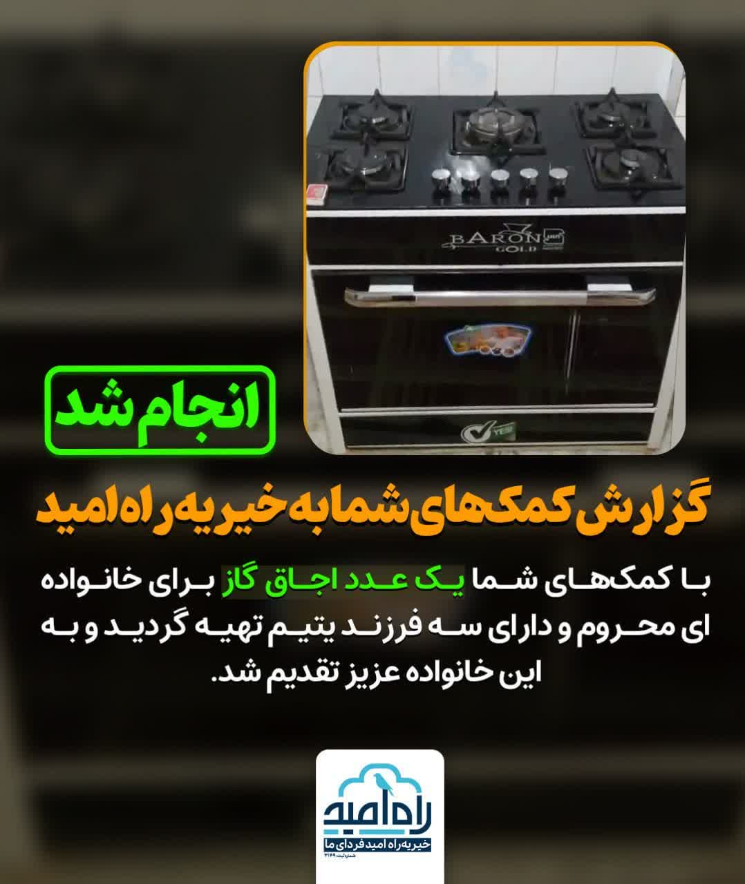 کمکهای شما یک عدد اجاق گاز برای خانوادهای محروم و دارای سه فرزند یتیم تهیه گردید و به این خانواده عزیز تقدیم شد.