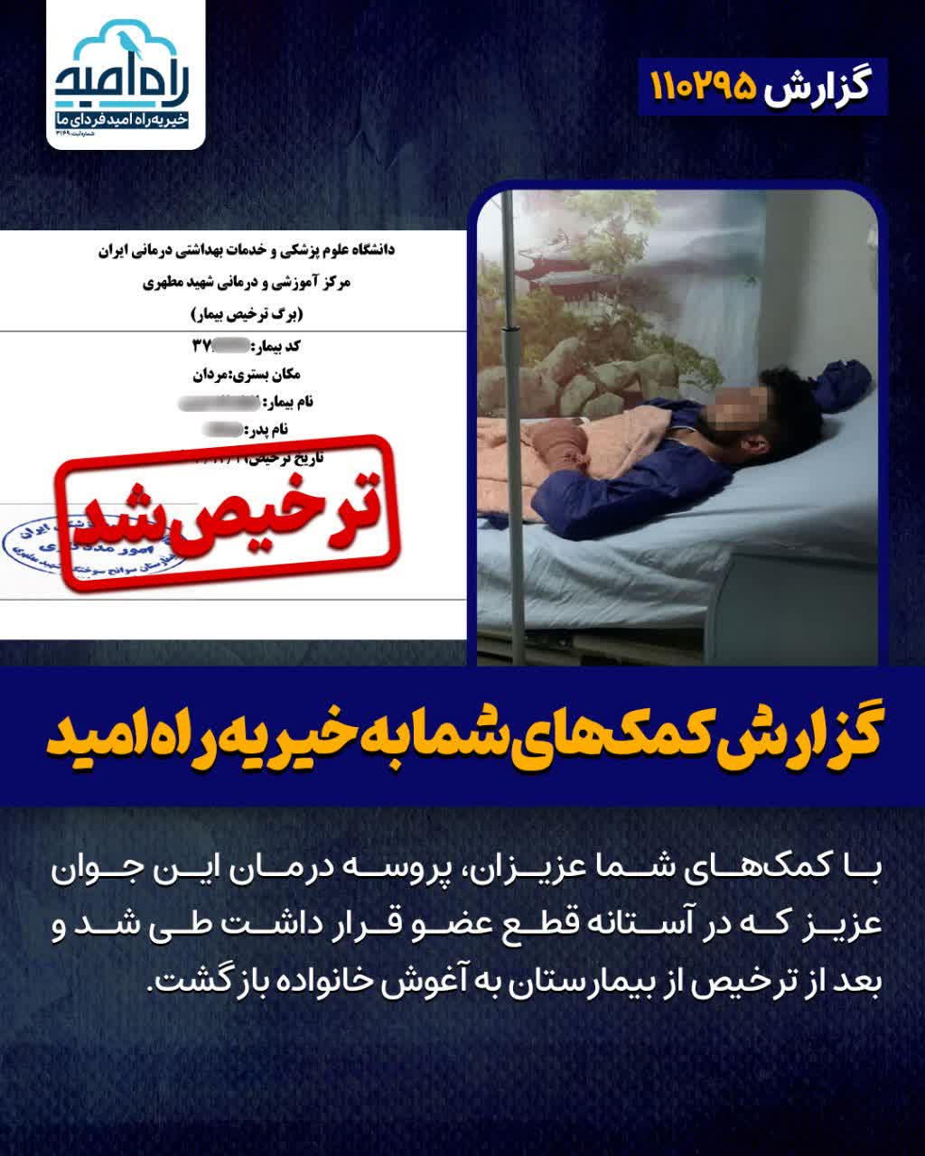 با کمکهای شما عزیزان، پروسه درمان این جوان عزیز که در آستانه قطع عضو قرار داشت طی شد و بعد از ترخیص از بیمارستان به آغوش خانواده بازگشت.