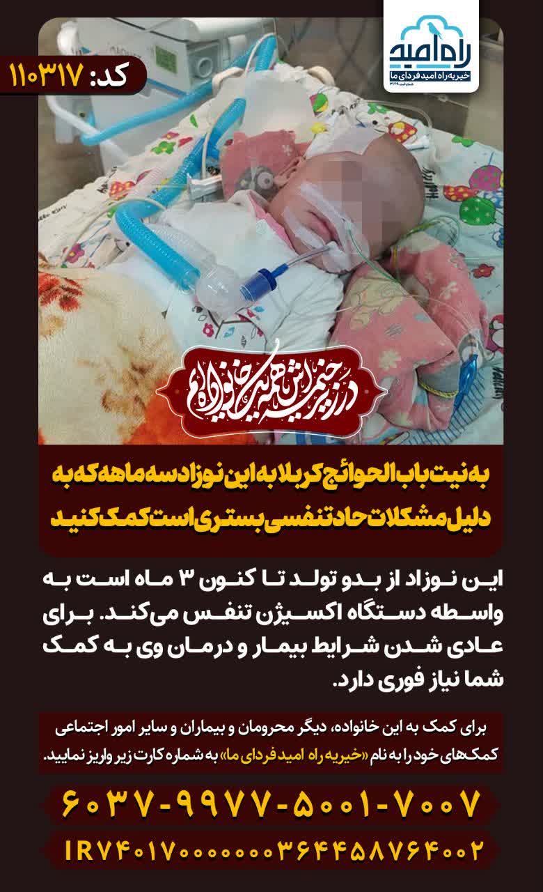 این نوزاد از بدو تولد تا کنون ۳ ماه است به واسطه دستگاه اکسیژن تنفس میکند. برای عادی شدن شرایط بیمار و درمان وی به کمک شما نیاز فوری دارد.
