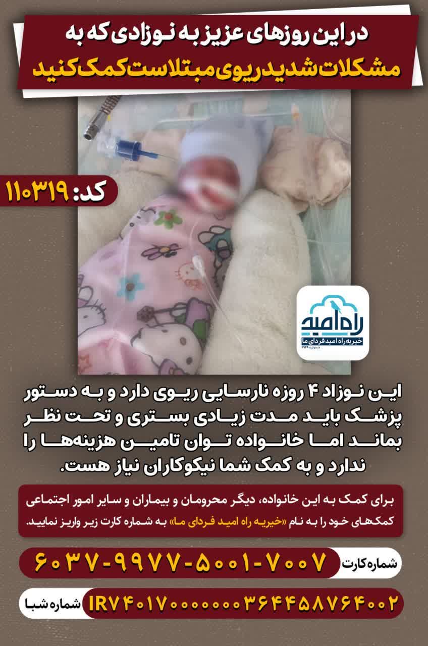 این نوزاد ۴ روزه نارسایی ریوی دارد و به دستور پزشک باید مدت زیادی بستری و تحت نظر بماند اما خانواده توان تامین هزینهها را ندارد و به کمک شما نیکوکاران نیاز هست.