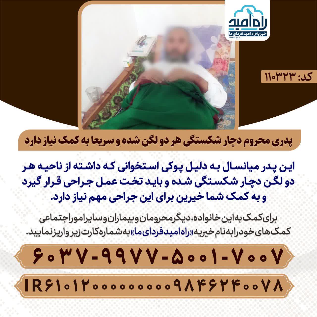 این پدر میانسال به دلیل پوکی استخوانی که داشته از ناحیه هر دو لگن دچار شکستگی شده و باید تخت عمل جراحی قرار گیرد و به کمک شما خیرین برای این جراحی مهم نیاز دارد.