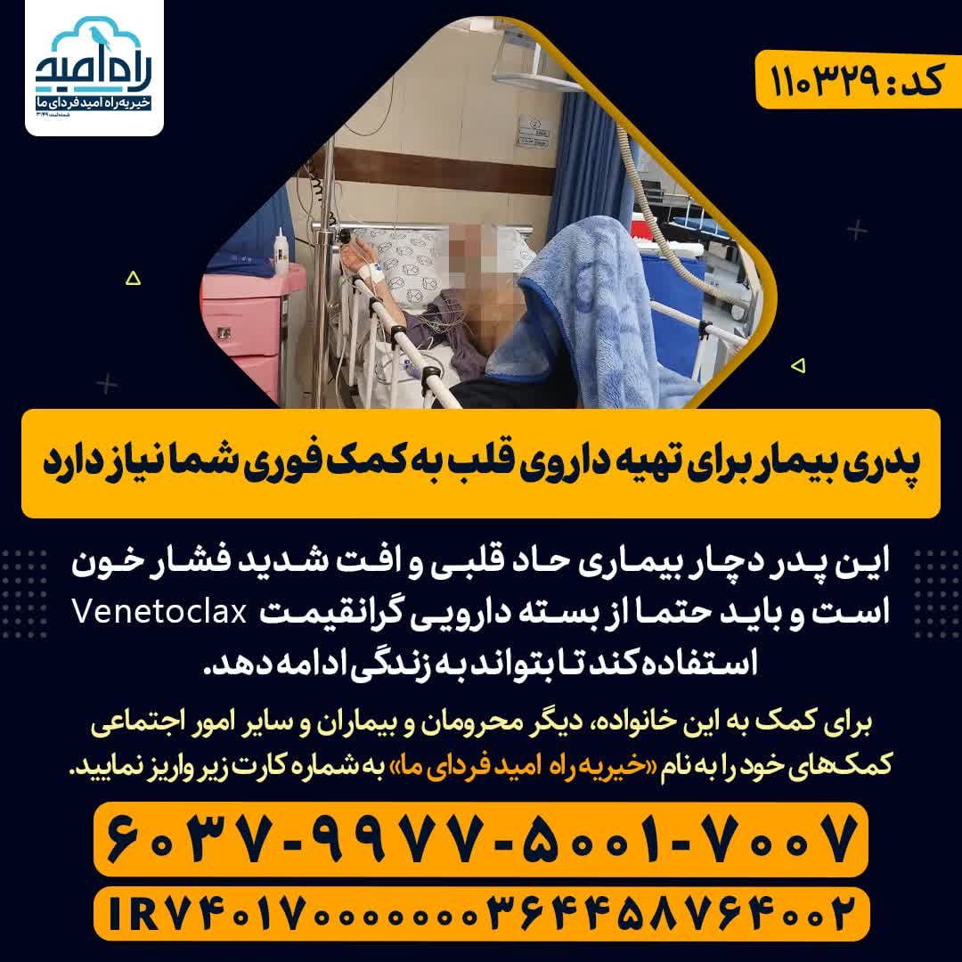 این پدر دچار بیماری حاد قلبی و افت شدید فشار خون است و باید حتما از بسته دارویی گرانقیمت Venetoclax استفاده کند تا بتواند به زندگی ادامه دهد.