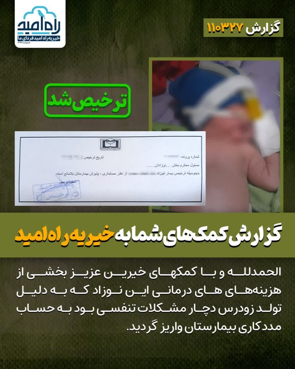 الحمدلله و با کمکهای خیرین عزیز بخشی از هزینههای های درمانی این نوزاد که به دلیل تولد زودرس دچار مشکلات تنفسی بود به حساب مددکاری بیمارستان واریز گردید.