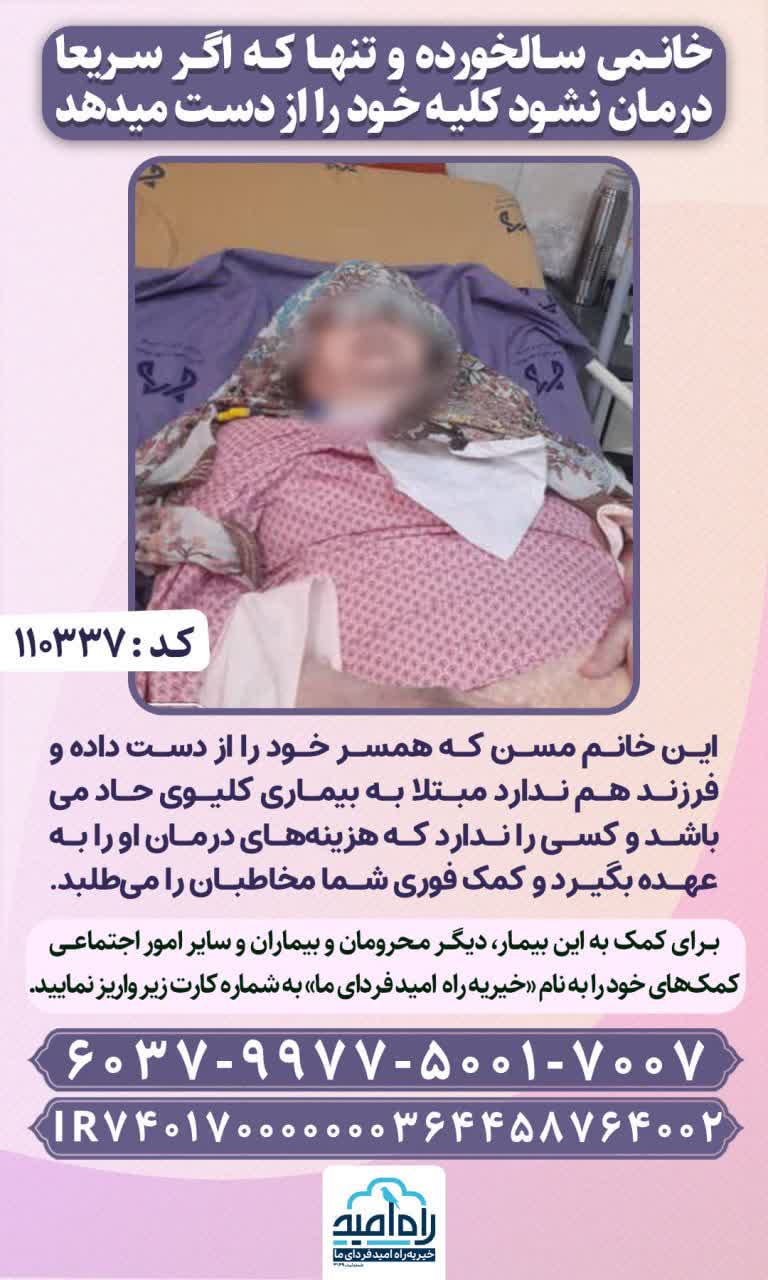 این خانم مسن که همسر خود را از دست داده و فرزند هم ندارد مبتلا به بیماری کلیوی حاد میباشد و کسی را ندارد که هزینههای درمان او را به عهده بگیرد و کمک فوری شما مخاطبان را میطلبد.