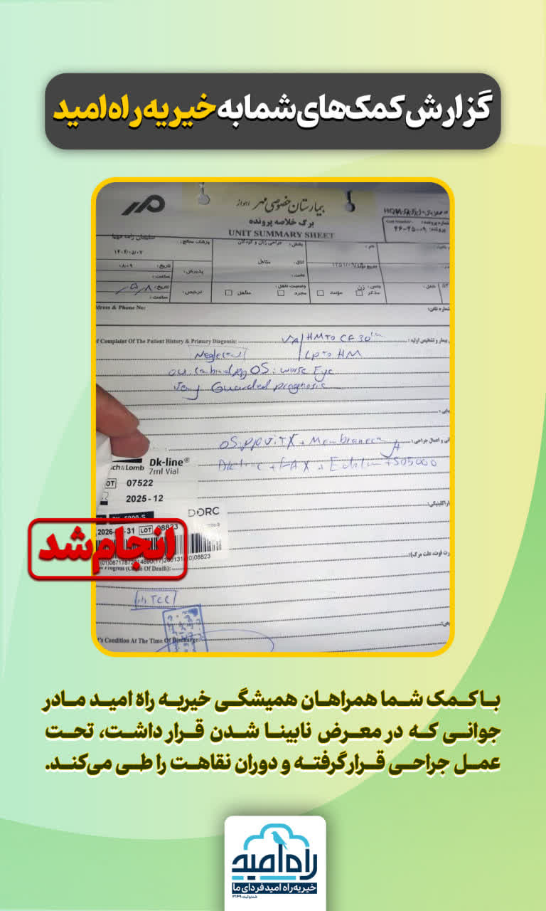 با کمک شما همراهان همیشگی خیریه راه امید مادر جوانی که در معرض نابینا شدن قرار داشت، تحت عمل جراحی قرار گرفته و دوران نقاهت را طی میکند.