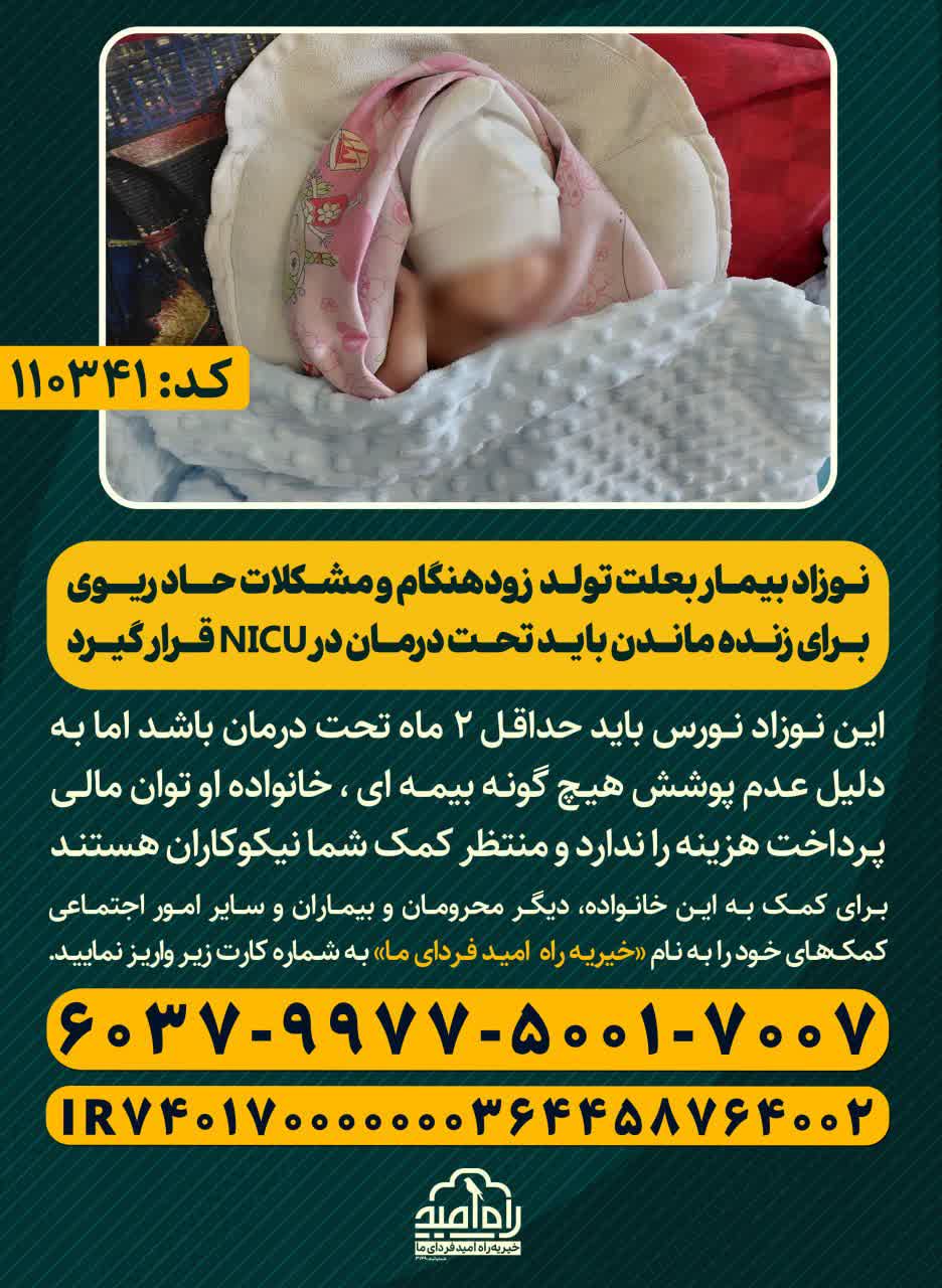 ایـن نــوزاد نــورس باید حداقـل ۲ ماه تحت درمان باشـد اما بـه دلیل عـدم پوشش هیـچ گونـه بیمــه ای ، خانواده او توان مالـی پـرداخت هزینه را ندارد و منتظر کمک شما نیکوکاران هستنـد.