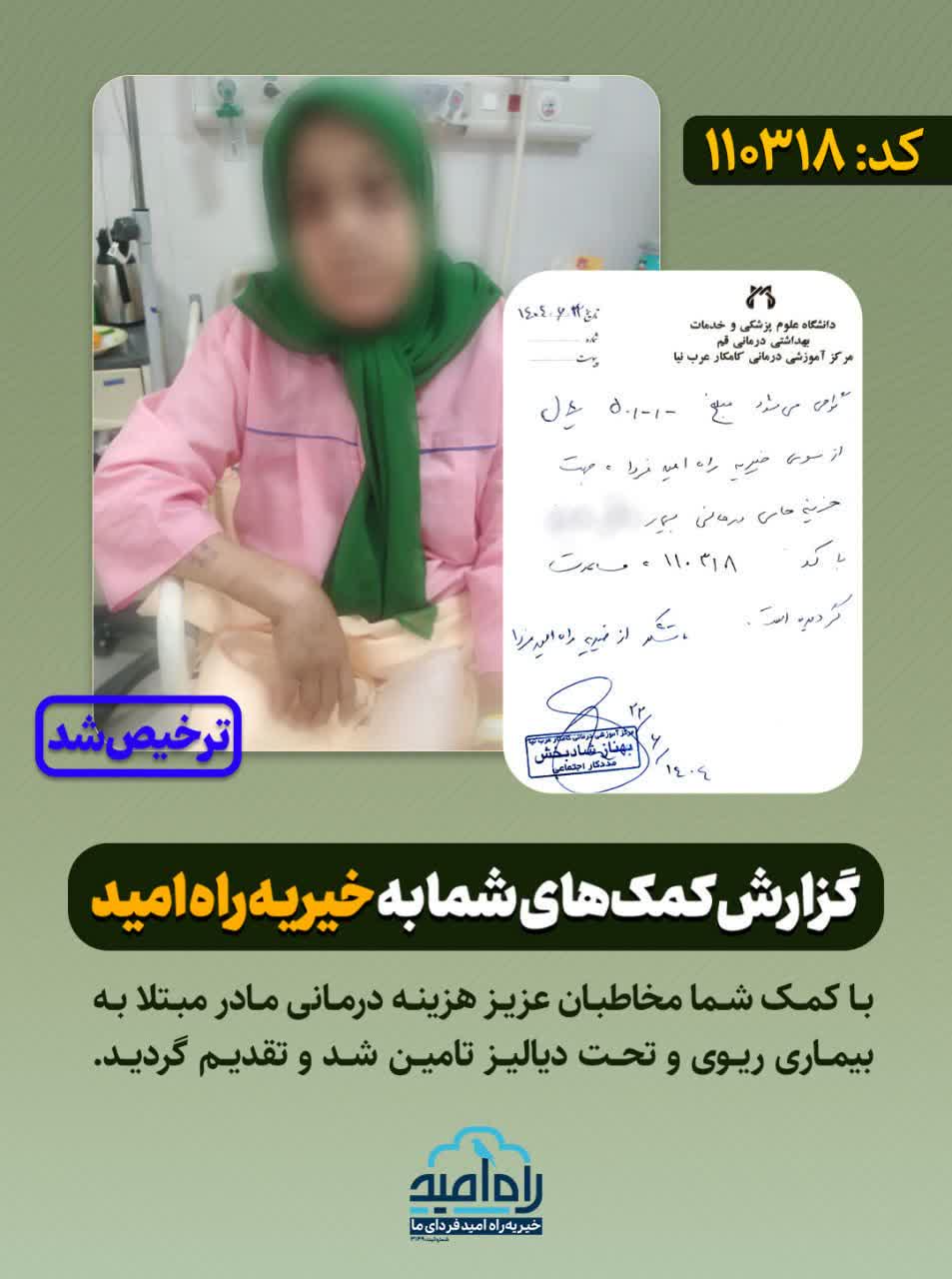 با کمک شما مخاطبان عزیز هزینه درمانی مادر مبتلا به بیماری ریوی و تحت دیالیز تامین شد و تقدیم گردید.