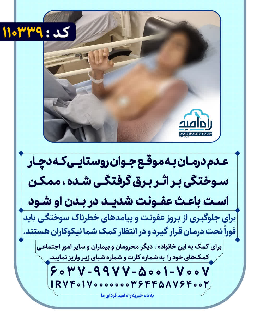 این جوان ۲۳ ساله برای جلوگیری از بروز عفونت و پیامدهای خطرناک سوختگی باید فوراً تحت درمان قرار گیرد و در انتظار کمک شما نیکوکاران هستند.