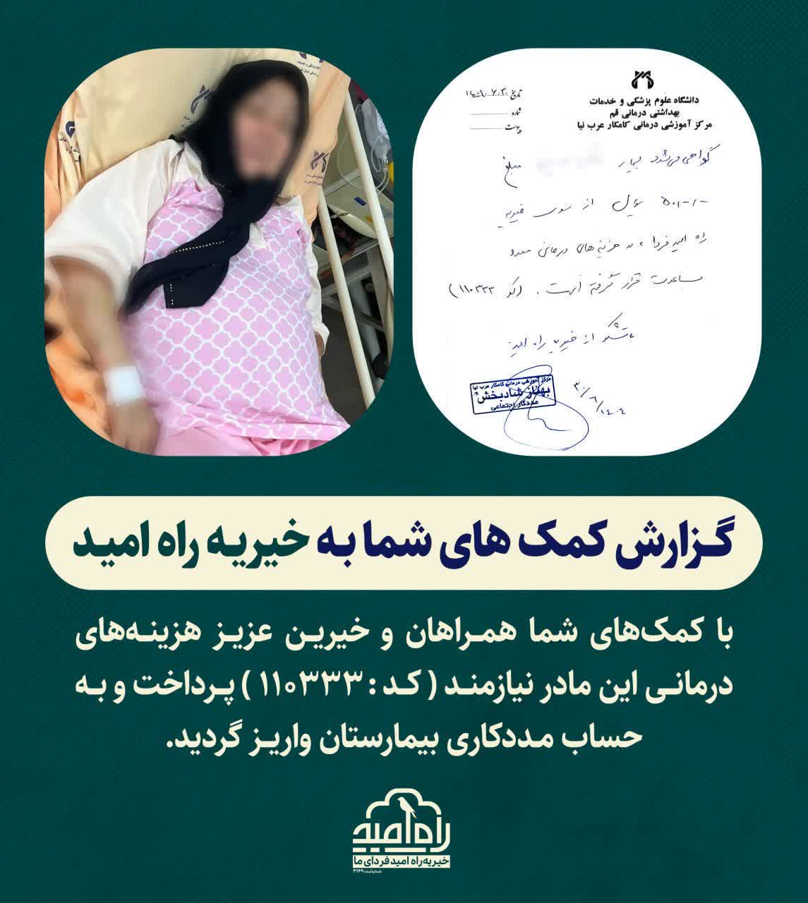 با کمکهای شما همــراهان و خیریــن عزیــز هزینــههای درمانــی این مادر نیازمنــد پــرداخت و بــه حساب مـددکاری بیمارستان واریــز گردید.
