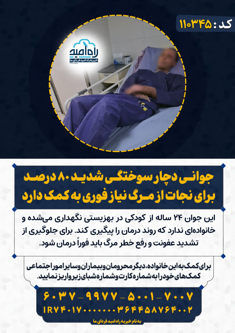 این جوان ۲۴ ساله از کودکی در بهزیستی نگهداری میشده و خانوادهای ندارد که روند درمان را پیگیری کند. برای جلوگیری از تشدید عفونت و رفع خطر مرگ باید فوراً درمان شود.