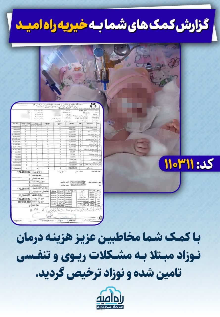 با کمک شما مخاطبین عزیز هزینه درمان نوزاد مبتلا به مشکلات ریوی و تنفسی تامین شده و نوزاد ترخیص گردید.