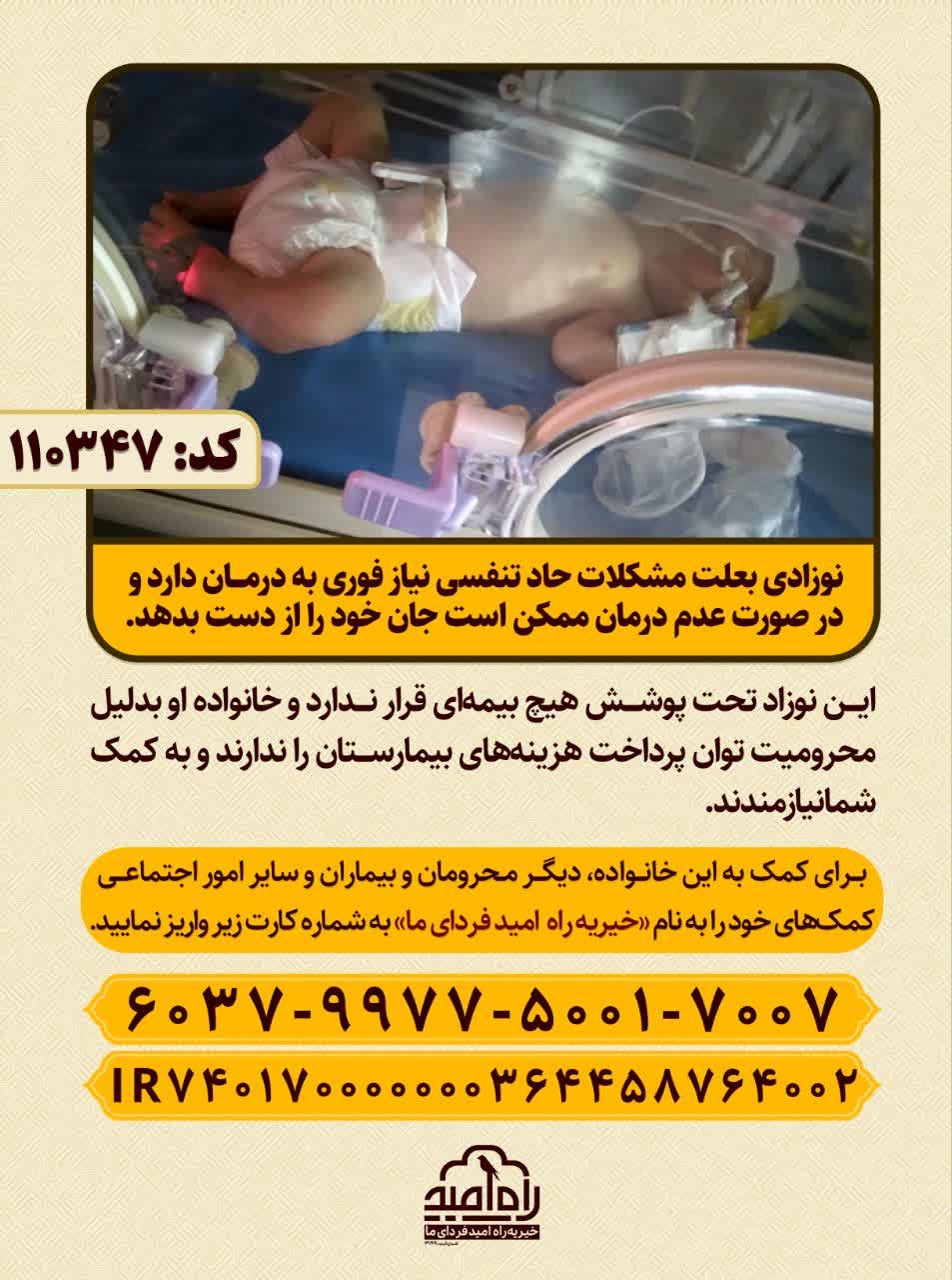 نوزاد از خانوادهای بیبضاعت هست که به دلیل اینکه از اتباع هستند تحت هیچ پوششی قرار نداشته و توان پرداخت هزینه درمان رو ندارند و نوزاد همچنان با مشکلات تنفسی مواجه است.