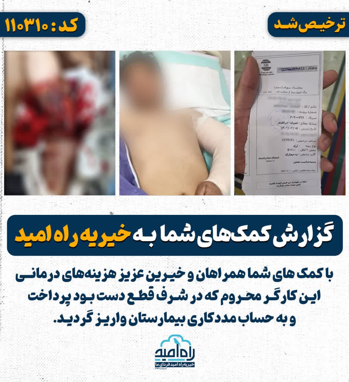 با کمکهای شما همراهان و خیرین عزیز هزینههای درمانی این کارگر محروم که در شرف قطع دست بود پرداخت و به حساب مددکاری بیمارستان واریز گردید.