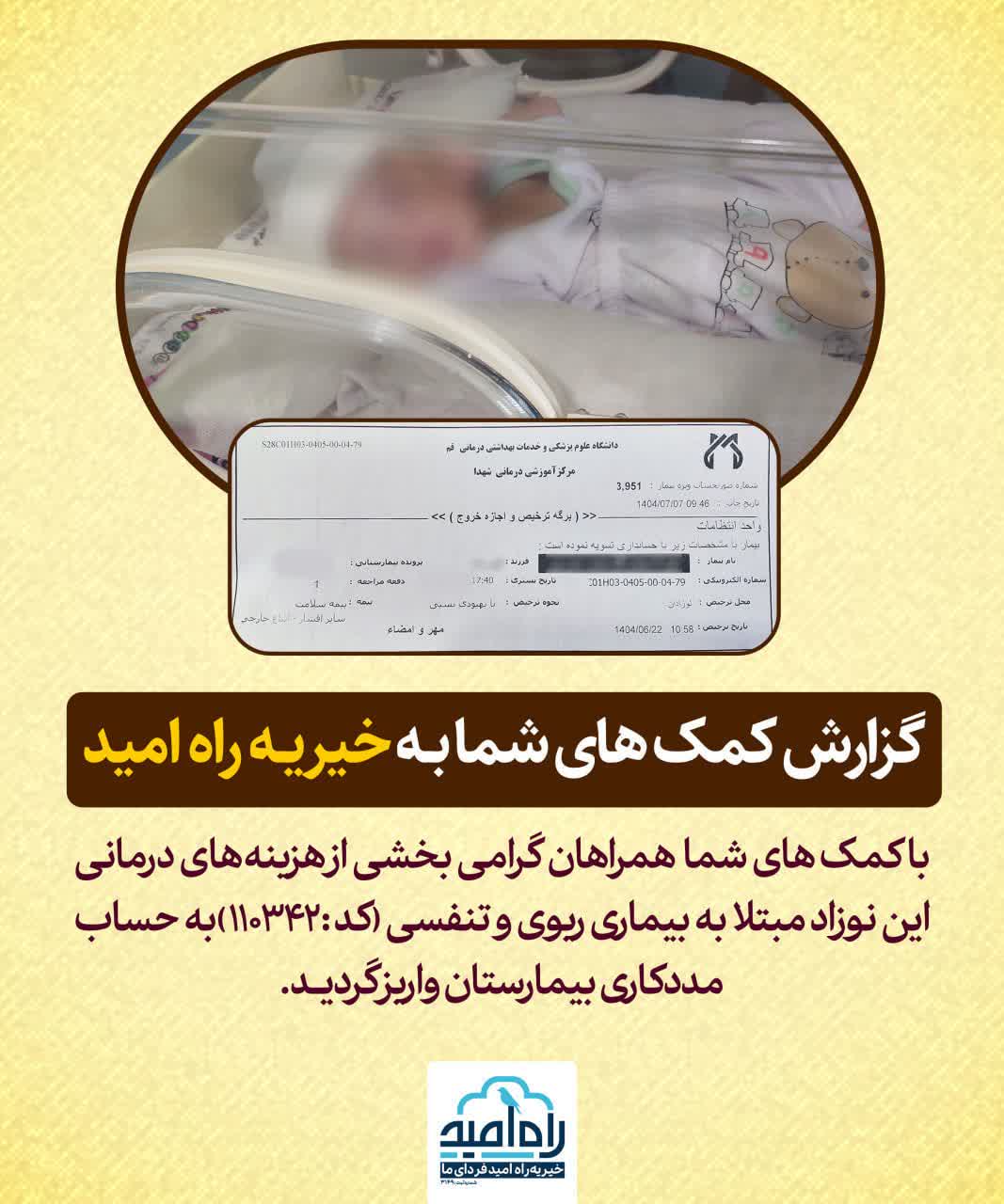 با کمک های شما همراهان گرامی بخشی از هزینههای درمانی این نوزاد مبتلا به بیماری ریوی و تنفسی به حساب مددکاری بیمارستان واریز گردیـد.