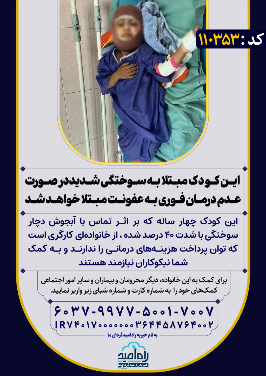 این کودک چهار ساله که بر اثـر تماس با آبجوش دچار سوختگی با شدت ۴۰ درصد شده ، از خانوادهای کارگری است که توان پرداخت هزینـههای درمانـی را ندارنـد و بـه کمک شما نیکوکاران نیازمند هستند.
