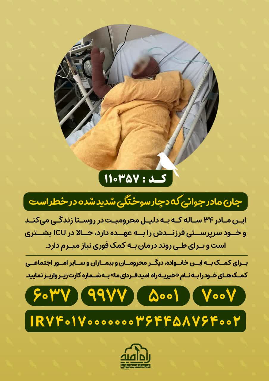 این مادر ۳۴ ساله که دچار سوختگی ۸۰ درصد شده به دلیل محرومیت در روستا زندگی میکند و خود سرپرستی فرزندش را به عهده دارد، حالا در ICU بشتری است و برای طی روند درمان به کمک فوری نیاز مبرم دارد.