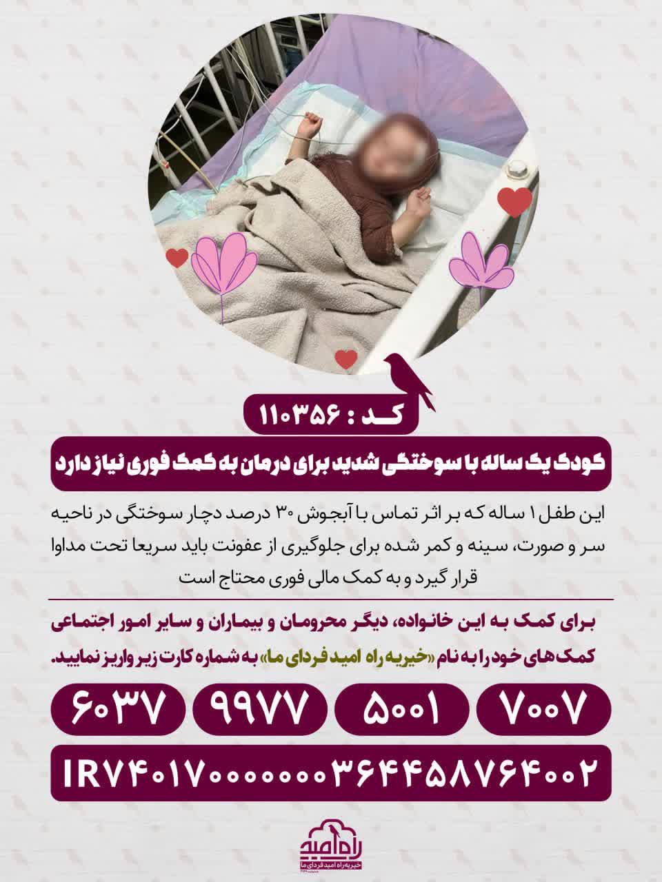 این طفل ۱ ساله که بر اثر تماس با آبجوش ۳۰ درصد دچار سوختگی در ناحیه سر و صورت، سینه و کمر شده برای جلوگیری از عفونت باید سریعا تحت مداوا قرار گیرد و به کمک مالی فوری محتاج است.