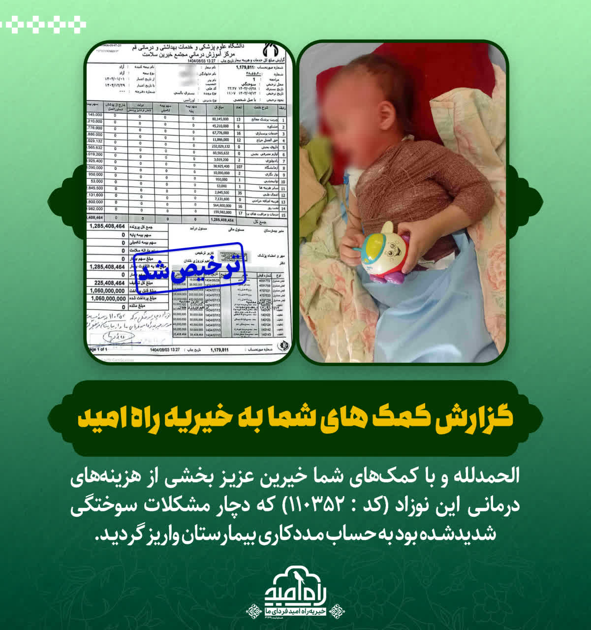 الحمدلله و با کمکهای شما خیرین عزیـز بخشی از هزینههای درمانـی این نوزاد که دچار مشکلات سوختگی شدیدشـده بود به حساب مـددکاری بیمارستان واریز گردیـد.