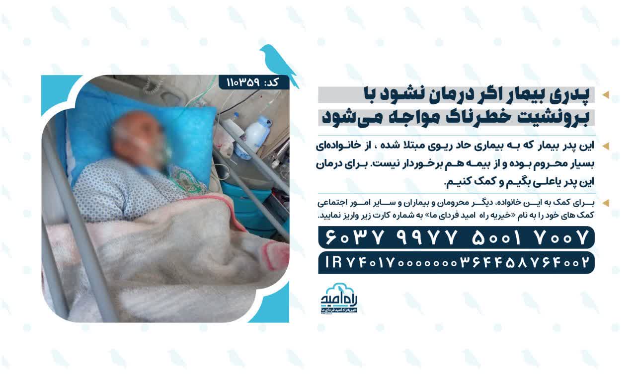 این پدر بیمار که به بیماری حاد ریوی مبتلا شده، از خانوادهای بسیار محروم بوده و از بیمه هم برخوردار نیست. برای درمان این پدر یا علی بگیم و کمک کنیم.اژ
