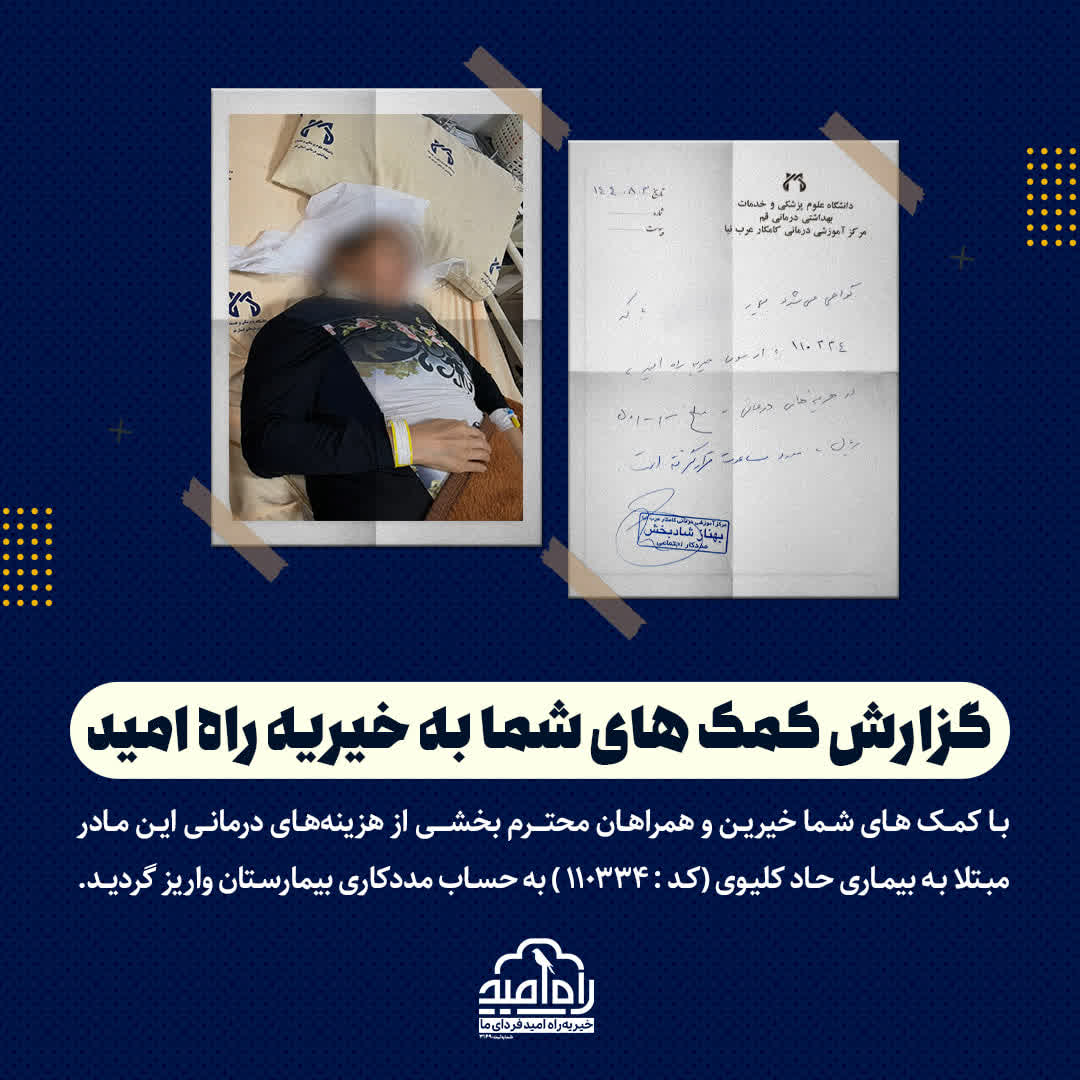 با کمک‌ های شما خیرین و همراهان محتــرم بخشــی از هزینه‌های درمانی این مادر مبتلا به بیماری حاد کلیوی به حساب مددکاری بیمارستان واریز گردیـد.