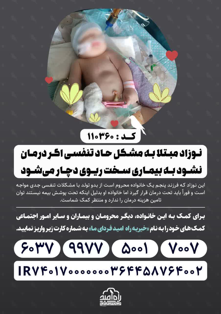 این نوزاد که فرزند پنجم یک خانواده محروم است از بدو تولد با مشکلات تنفسی جدی مواجه است و فوراً باید تحت درمان قرار گیرد اما خانواده او بدلیل اینکه تحت پوشش بیمه نیستند توان تامین هزینه درمان را ندارد و منتظر کمک شماست.