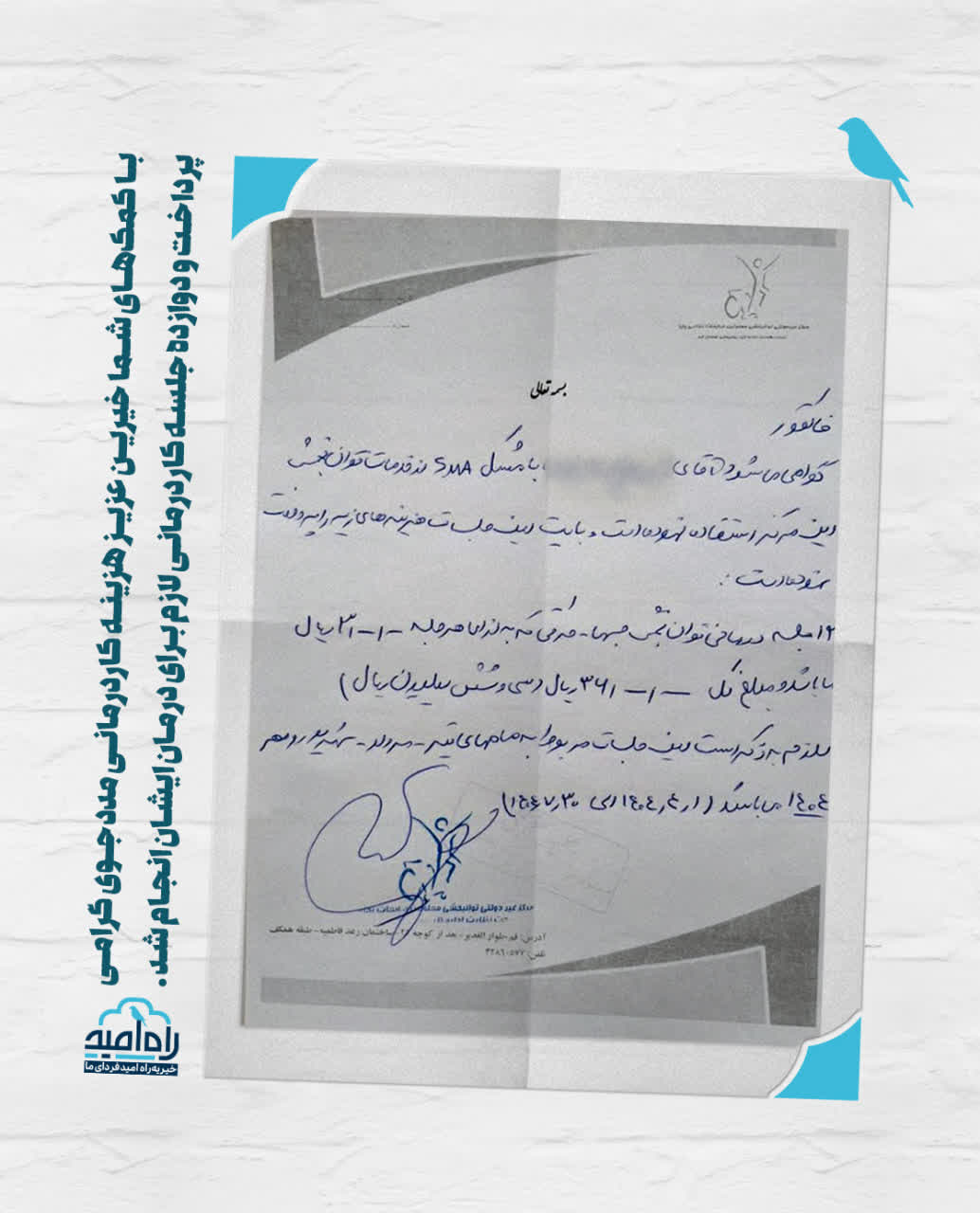 با کمکهای شما خیرین عزیز هزینه کاردرمانی مددجوی گرامی پرداخت و دوازده جلسه کاردرمانی لازم برای درمان ایشان انجام شد .