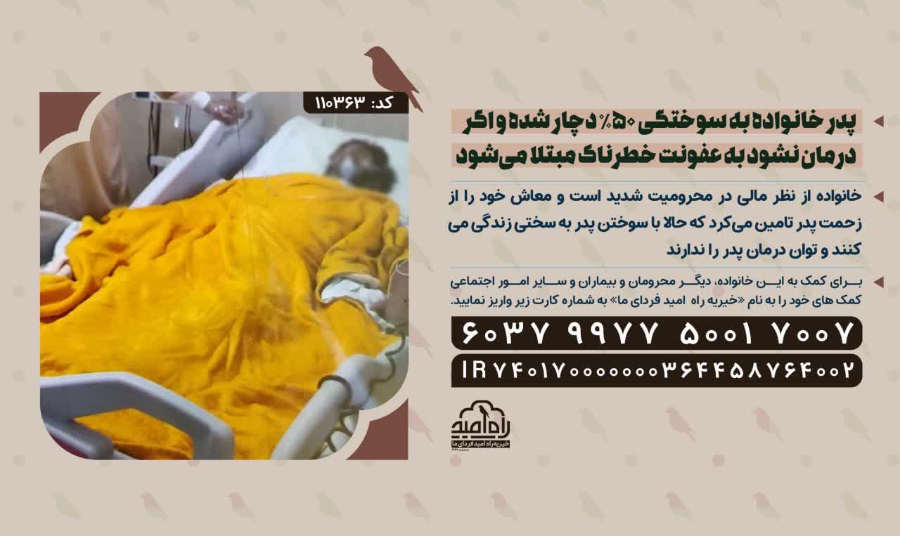 خانواده از نظر مالی در محرومیت شدید است و معاش خود را از زحمت پدر تامین میکرد که حالا با سوختن پدر به سختی زندگی میکنند و توان درمان پدر را ندارند
