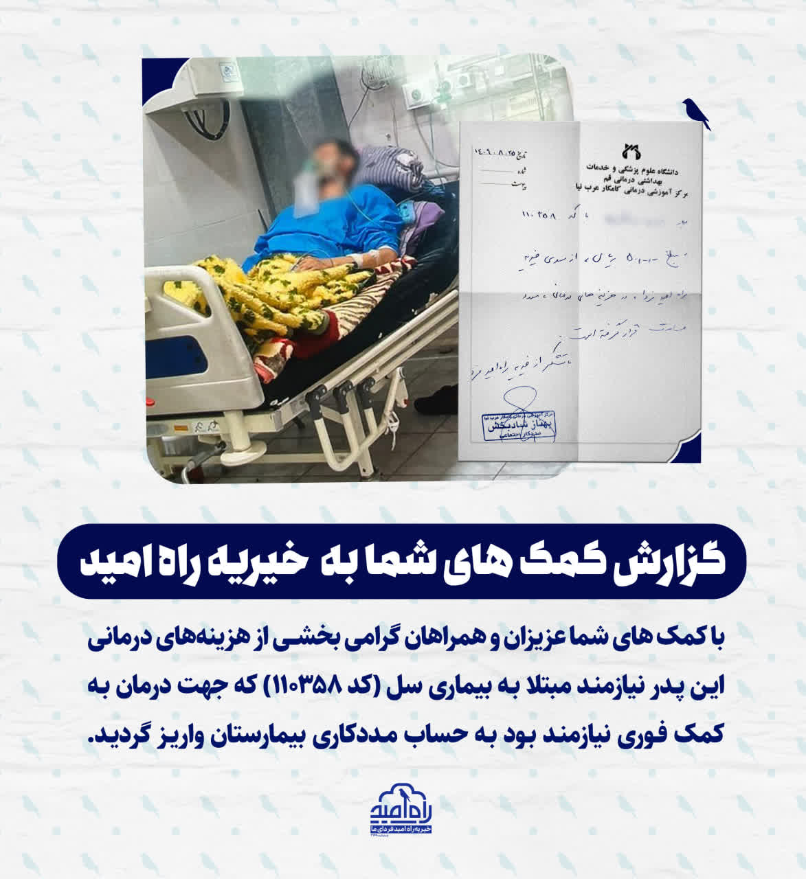 با کمک های شما عزیزان و همراهان گرامی بخشــی از هزینههای درمانی ایـن پـدر نیازمنـد مبتلا بـه بیماری سل که جهت درمان بـه کمک فـوری نیازمنـد بـود بـه حساب مـددکاری بیمارستان واریـز گردیـد.