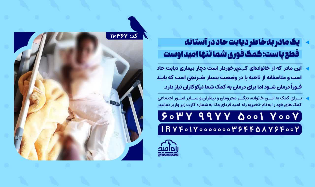 این مادر که از خانوادهای کمبرخوردار است دچار بیماری دیابت حاد است و متاسفانه از ناحیه پا در وضعیت بسیار بغرنجی است که باید فوراً درمان شود اما برای درمان به کمک شما نیکوکاران نیاز دارد