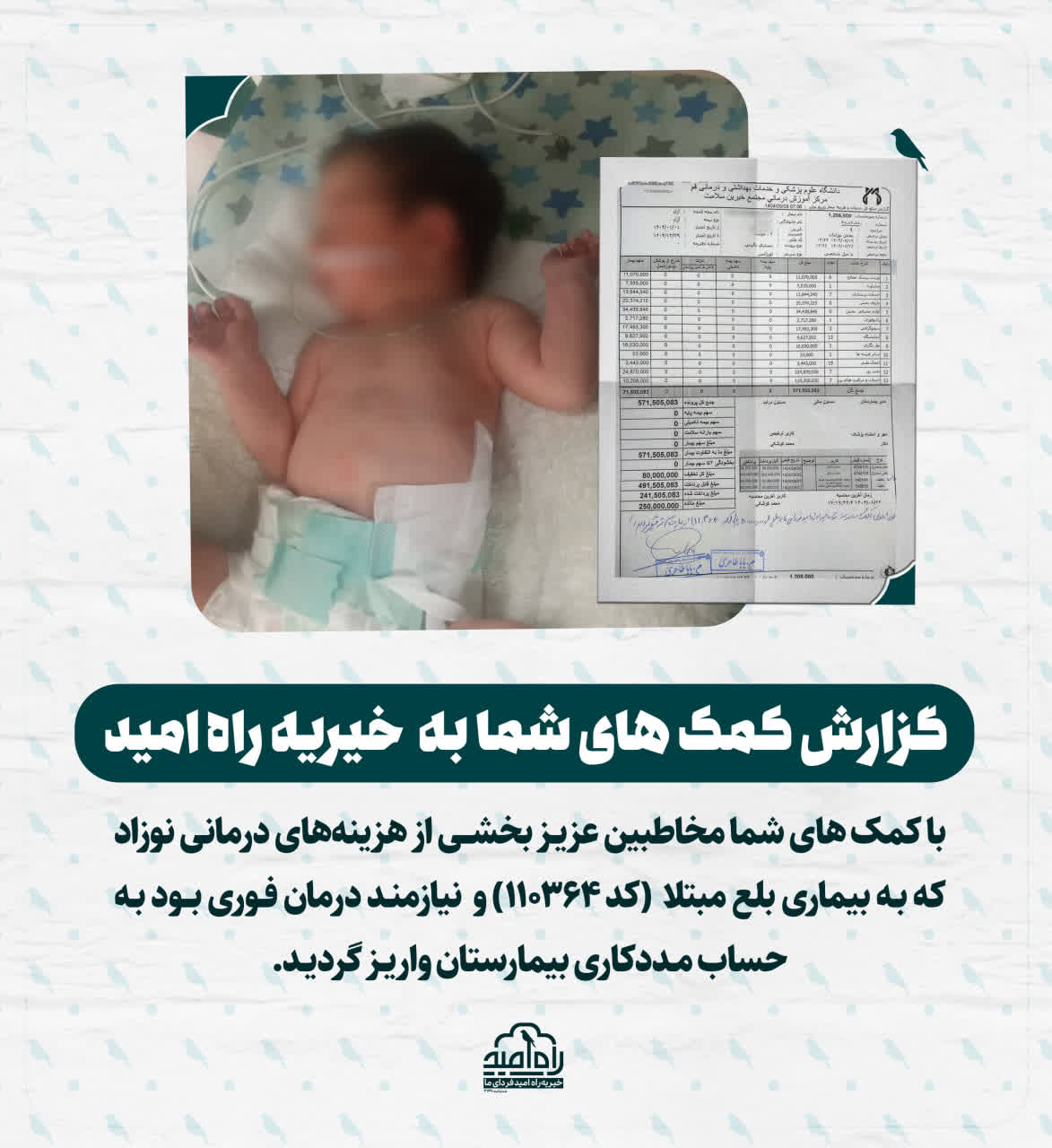 با کمک‌ های شما مخاطبین عزیـز بخشــی از هزینه‌های درمانی نوزاد که بـه بیماری بلع مبتلا و نیازمنـد درمان فـوری بــود بـه حساب مـددکاری بیمارستان واریـز گردیـد.