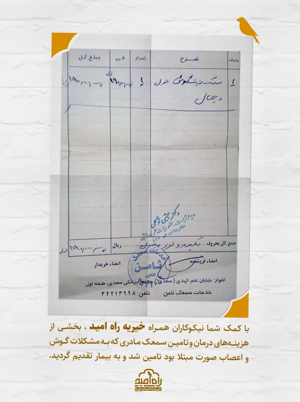 با کمک شما نیکوکاران همراه خیریه راه امید بخشی از هزینه های درمان تامین سمعک مادری که به مشکلات گوش واعصاب صورت مبتلا بود تامین و به بیمار تقدیم گردید