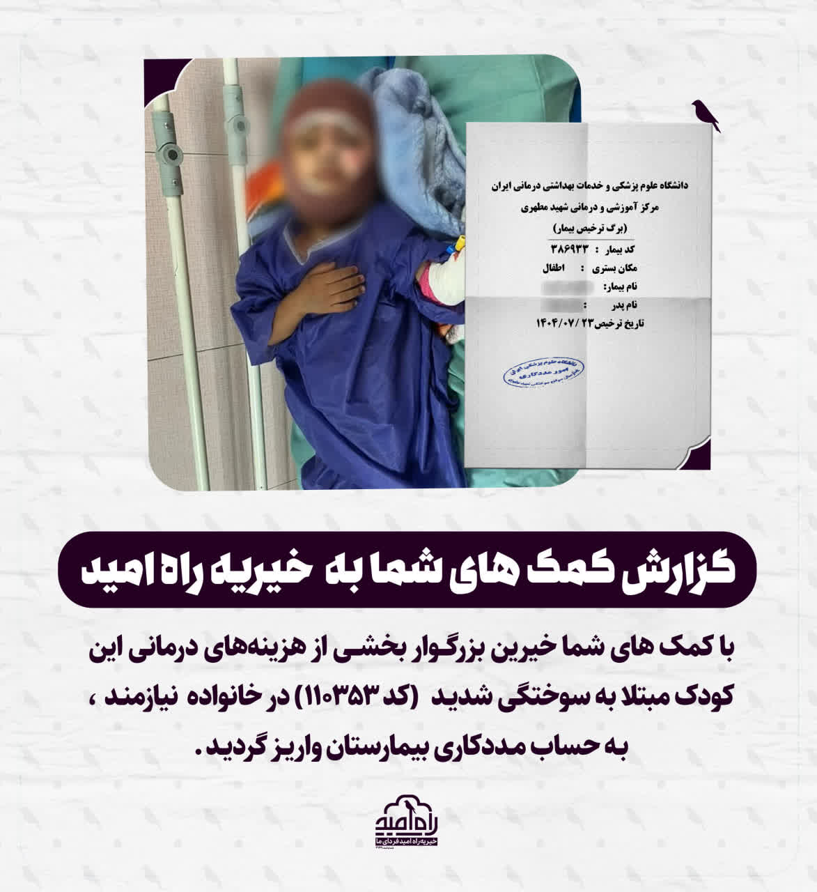 با کمک های شما خیرین بزرگــوار بخشــی از هزینههای درمانی این کودک مبتلا به سوختگی شدیـد در خانواده نیازمنـد ، بـه حساب مـددکاری بیمارستان واریـز گردیـد .