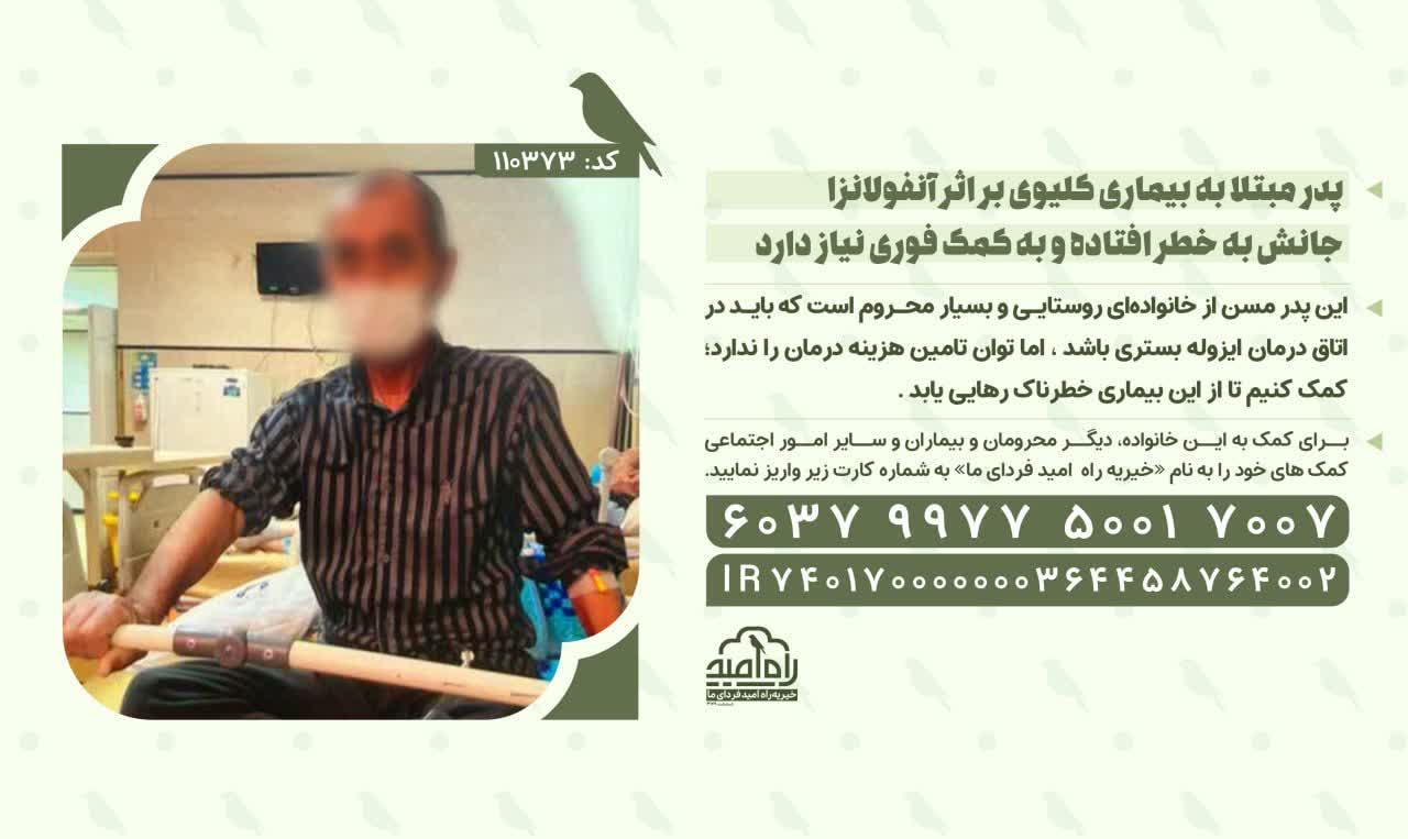 این پدر ۶۷ ساله به مشکلات شدید کلیوی دچار بوده و اخیراً بر اثر ابتلاء به آنفلوآنزا این بیماری تشدید شده و نیاز به درمان فوری پیدا کرده اما توان مالی برای این کار را ندارد و منتظر کمک شماست