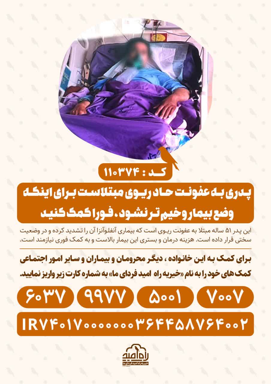 این پدر ۵۱ ساله مبتلا به عفونت ریوی است که بیماری آنفلوآنزا آن را تشدید کرده و در وضعیت سختی قرار داده است. هزینه درمان و بستری این بیمار بالاست و به کمک فوری نیازمند است