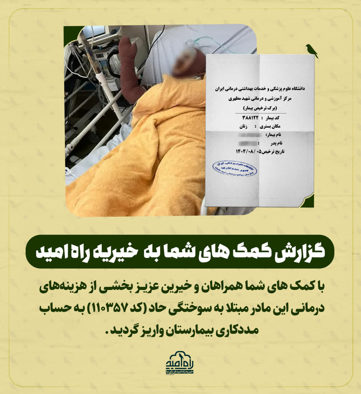 با کمک های شما همراهان و خيرين عزیــز بخشــی از هزینههای درمانـی این مادر مبتلا به سوختگی حاد بـه حساب مـددکاری بیمارستان واریـز گردیـد .