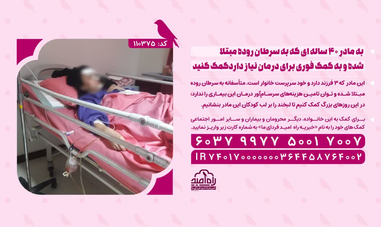 این مادر که ۳ فرزند دارد و خود سرپرست خانوار است، متأسفانه به سرطان روده مبتلاست و توان تامین هزینههای سرسامآور درمان این بیماری را ندارد. در این روزهای بزرگ کمک کنیم تا لبخند را بر لب کودکان این مادر بنشانیم