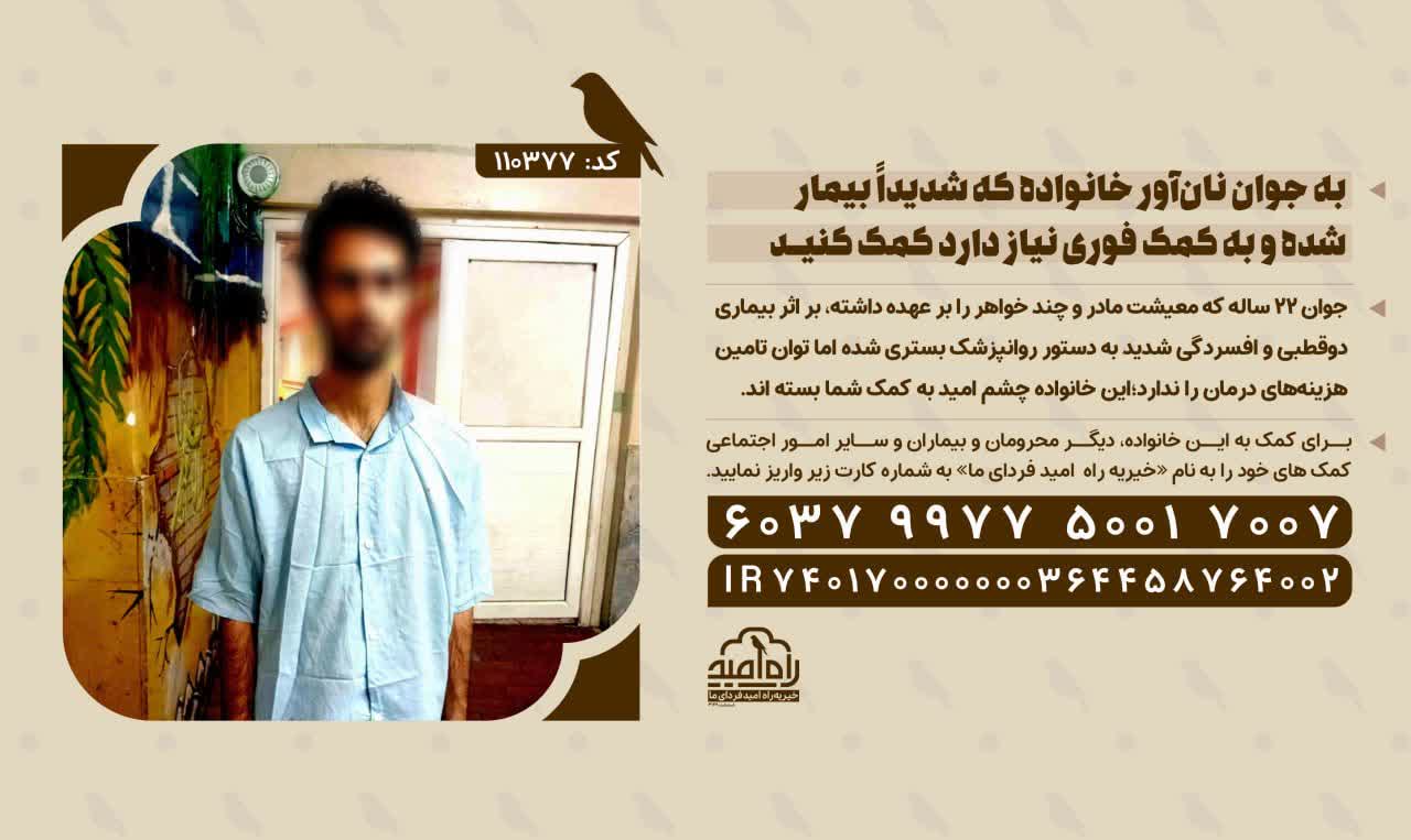 جوان ۲۲ ساله که معیشت مادر و چند خواهر را بر عهده داشته، بر اثر بیماری دوقطبی و افسردگی شدید به دستور روانپزشک بستری شده اما توان تامین هزینههای درمان را ندارد ؛ این خانواده چشم امید به کمک شما بسته اند.