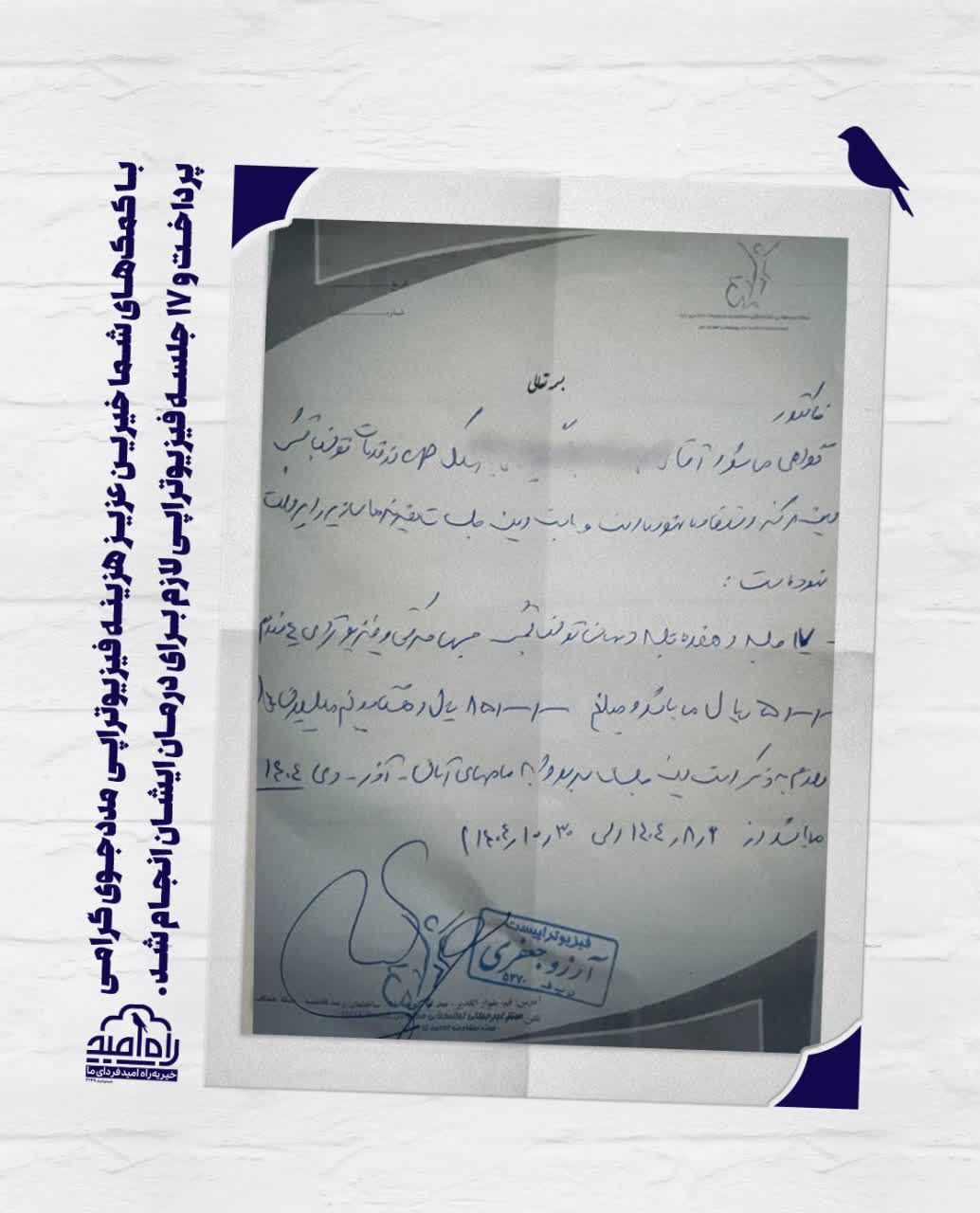 با کمکهای شما خیرین عزیز هزینه فیزیوتراپی مددجوی گرامی پرداخت و 17 جلسه فیزیوتراپی لازم برای درمان ایشان انجام شد .