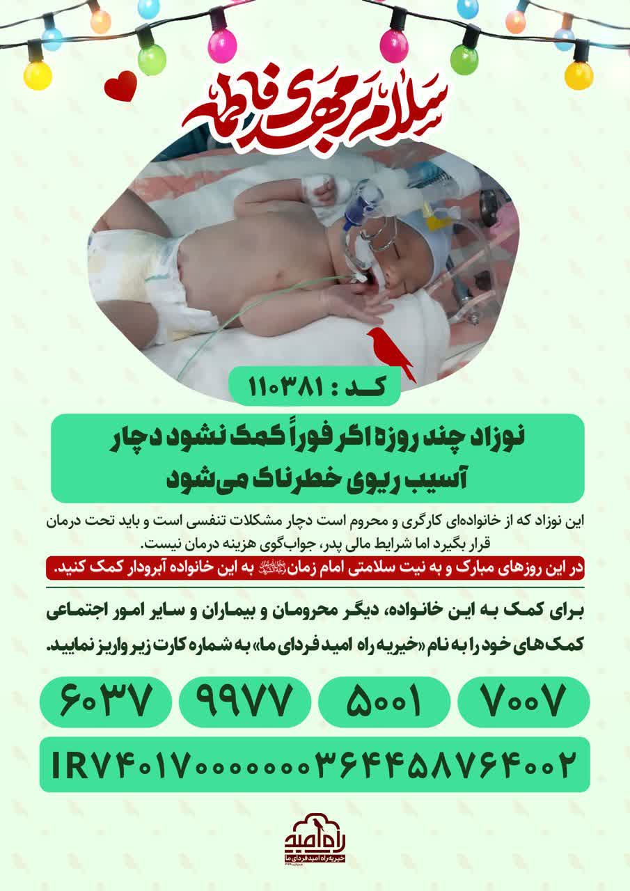 این نوزاد که از خانوادهای کارگری و محروم است دوار مشکلات تنفسی است و باید تحت درمان قرار بگیرد اما شرایط مالی پدر جوابگوی هزینه درمان نیست.