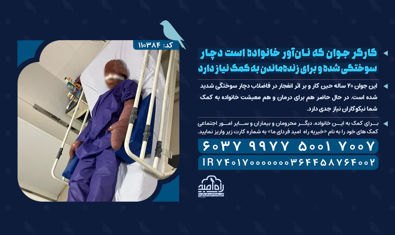 این جوان ۲۰ ساله حین کار و بر اثر انفجار در فاضلاب دچار سوختگی شدید شده است. در حال حاضر هم برای درمان و هم معیشت خانواده به کمک شما نیکوکاران نیاز جدی دارد.برای کمک به این خانواده، دیگر محرومان و بیماران و سایر امور اجتماعی کمکهای خود را به نام «خیریه راه امید فردای ما»