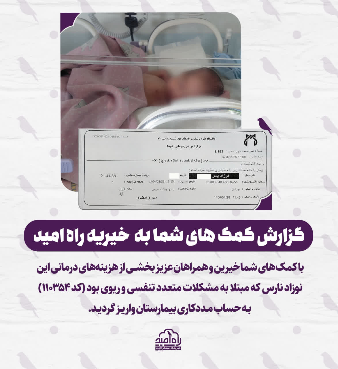 با کمک های شما خیرین و همراهان عزیز بخشــی از هزینههای درمانی این نوزاد نارس که مبتلا به مشکلات متعدد تنفسی و ریوی بود بـه حساب مـددکاری بیمارستان واریـز گردیـد.