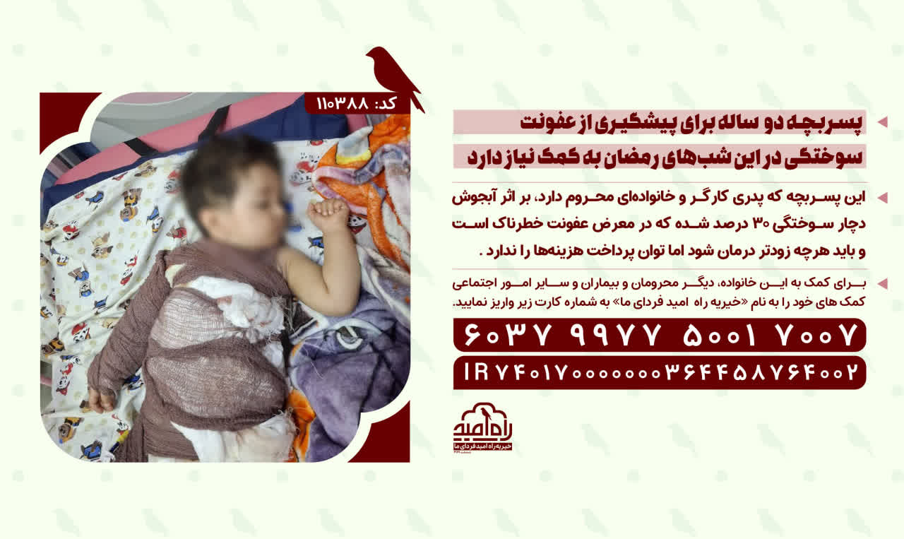 این پسربچه که پدری کارگر و خانوادهای محروم دارد، بر اثر آبجوش دچار سوختگی ۳۰ درصد شده که در معرض عفونت خطرناک است و باید هرچه زودتر درمان شود اما توان پرداخت هزینهها را ندارد.