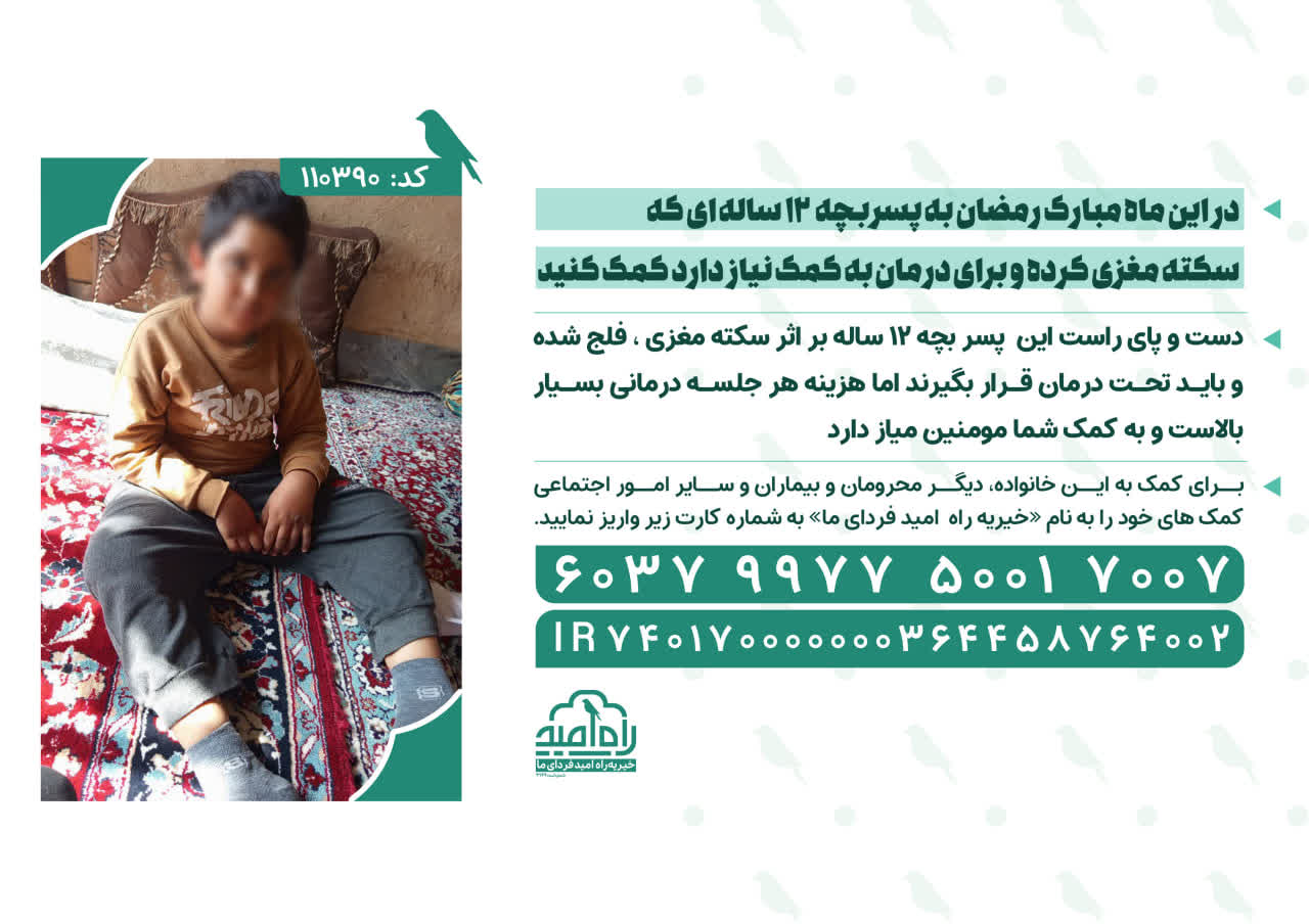 دست و پای راست این پسر بچه 12 ساله بر اثر سکته مغزی ، فلج شده و باید تحت درمان قرار بگیرند اما هزینه هر جلسه درمانی بسیار بالاست و به کمک شما مومنین نیاز دارد